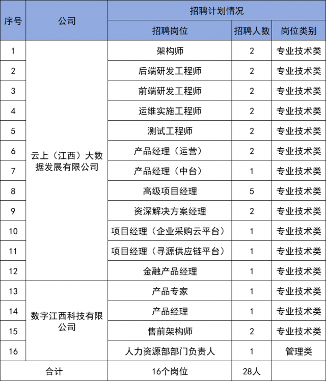 因业务发展需要,云上(江西)大数据发展有限公司(以下简称“云上江西公司”)及下属子公司现面向社会公开招聘28名工作人员。现将有关事项公告如下: