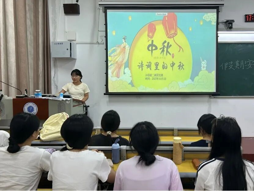 活动伊始,全体同学起立,齐唱团歌,在庄重的团歌声中,本次团日活动正式开始。本次团日活动融合了室内交流与户外实践。室内,同学们在团支书的引导下,踊跃分享家乡中秋习俗,并展开了精彩的“飞花令”诗词对决,在文化的交流与碰撞中,深刻感悟传统节日的多元魅力;转至户外,大家则通过一系列团队协作游戏,在欢声笑语与紧密配合中,切实锤炼了团队精神,拉近了彼此距离。整场活动不仅深化了同学们的文化认同,更显著提升了集体的凝聚力与向心力。