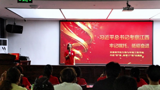 宣讲以习近平总书记在江西的考察足迹为主线,带领大家共同学习习近平总书记考察江西重要讲话精神。重点聚焦陶瓷文化保护传承、企业技术创新、湿地公园生态保护、推进乡村振兴四个关键词展开宣讲。在此次宣讲中,实践队成员着重讲述了习近平总书记在江西景德镇的考察活动,并指出,中华优秀传统文化自古至今从未断流,陶瓷是中华瑰宝,是中华文明的重要名片。实践队成员表示,作为中华优秀传统文化的一部分,景德镇陶瓷文化应该被大家保护与传承,实践队将会竭尽所能,努力推进陶瓷文化保护与文旅产业发展的良性互动,同时,要集聚各方面人才,加强创意设计和研发创新,用改革创新带动陶瓷文化的传承与发扬,陶瓷产业的发展和振兴,在深入推进“一带一路”的过程中,进一步搭建对外交流平台,把陶瓷产业做大做强,把“千年瓷都”这张靓丽的名片擦得更亮。2023年10月,习近平总书记在考察江西时又指出,“优美的自然环境本身就是乡村振兴的优质资源,要找到实现生态价值转换的有效途径,让群众得到实实在在的好处。” 实践队成员在宣讲中将习近平总书记考察江西的重要工作指示与实际相结合,习近平总书记指出要坚持农业农村优先发展,加快农业农村现代化建设步伐,推进农业产业化,推动农村一二三产业融合发展,全面推进乡村振兴。浮梁县峙滩镇流口村围绕“浮梁茶”产业,致力于打造一个集茶叶种植、加工、销售、科研及茶文化旅游于一体的茶产业生态链,实现三产融合发展。同时,该镇扎实推进村庄美化亮化工程,全力改善村庄面貌和人居环境,打造乡村振兴样板,不断提升群众的获得感、幸福感。