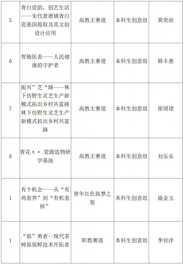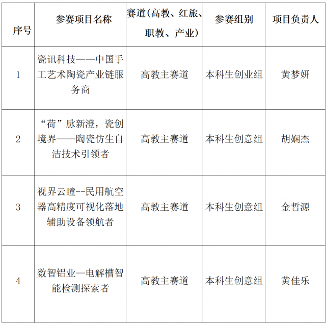 根据江西省大学生创新大赛(2025)赛事要求,经过项目申报、院赛推优、校赛辅导、综合评议等环节,参照省教育厅名额分配,拟推荐以下8个高教主赛道项目、1个红旅赛道项目,1个职教赛道项目参加省赛,现予以公示。