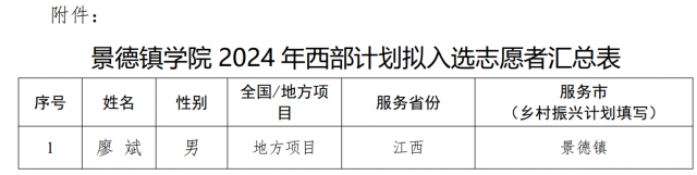 根据江西省大学生志愿服务西部计划项目管理办公室《关于做好2024-2025年度西部计划愿者招募派遣工作的通知》《关于2024—2025年度江西省大学生志愿服务西部计划志愿者补录工作的提醒》文件要求,我校在公开招募、自愿报名、学院推荐的基础上,严格招募选拔流程,经学校西部计划项目办资格审查、笔试、面试、心理测试环节,最终拟录取我校经济管理学院应届毕业生廖斌同学为2024年大学生志愿服务西部计划(江西项目)志愿者,具体拟录取信息见附件。