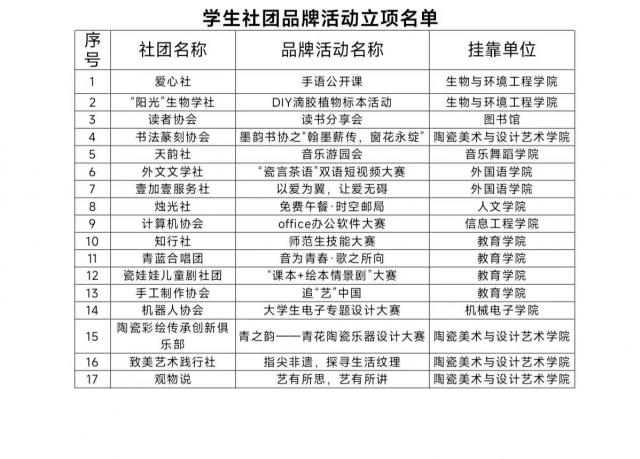 附件:《景德镇学院学生社团品牌活动立项名单》