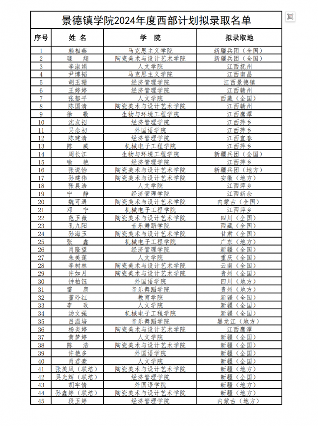 根据江西省大学生志愿服务西部计划项目管理办公室《关于做好2024-2025年度西部计划愿者招募派遣工作的通知》要求,我校在公开招募、自愿报名、学院推荐的基础上,严格招募选拔流程,经纪委监督、学工处、教务处、校团委资格审查、笔试、面试、心理测试环节,拟录取我校应届毕业生赖相燕等 45名同学为 2024年大学生志愿服务西部计划(含江西项目)志愿者,具体拟录取信息见附件。
