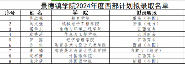 根据江西省大学生志愿服务西部计划项目管理办公室《关于做好2024-2025年度西部计划愿者招募派遣工作的通知》要求,我校在公开招募、自愿报名、学院推荐的基础上,严格招募选拔流程,经纪委监督、学工处、教务处、校团委资格审查、笔试、面试、心理测试环节,拟补录我校应届毕业生吴淑琳等9名同学为2024年大学生志愿服务西部计划(含江西项目)志愿者,具体拟录取信息见附件。