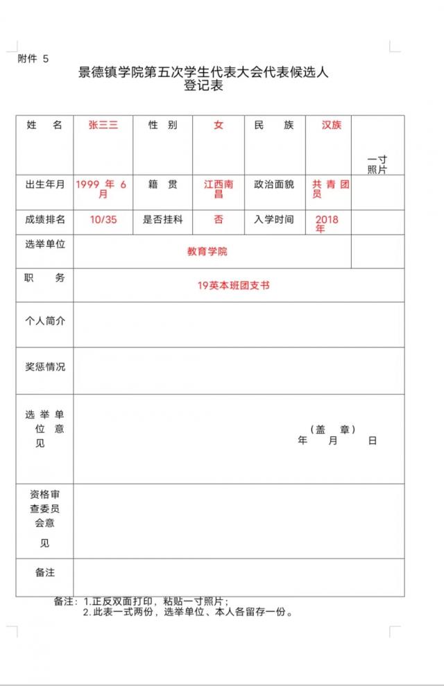 5.景德镇学院第五次学生代表大会代表候选人登记表