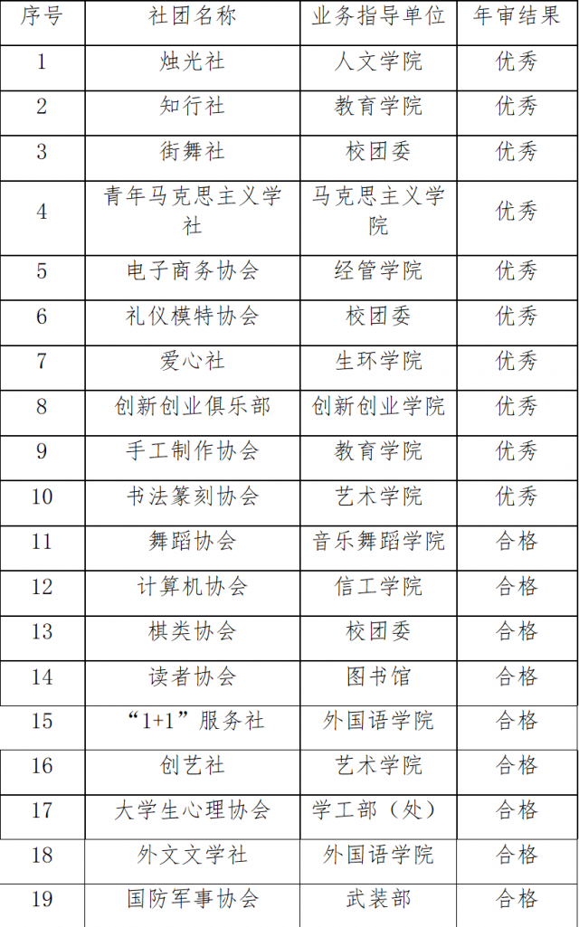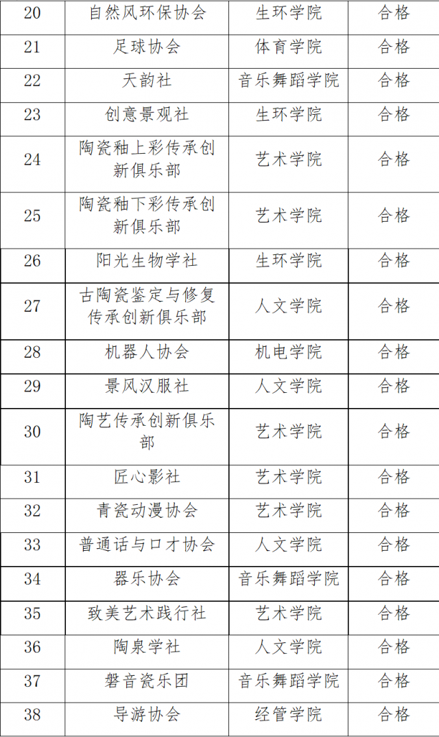 为进一步加强学生社团规范管理,发挥学生社团育人功能,促进学生社团健康发展,根据《景德镇学院学生社团建设管理办法》(景院党发〔2020〕61 号)要求,现将2022-2023学生社团年审结果公告如下: