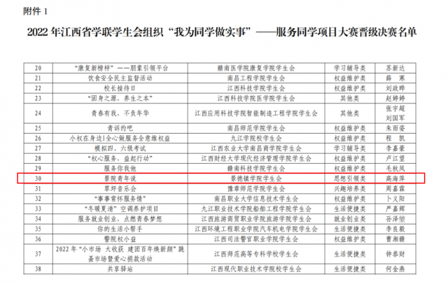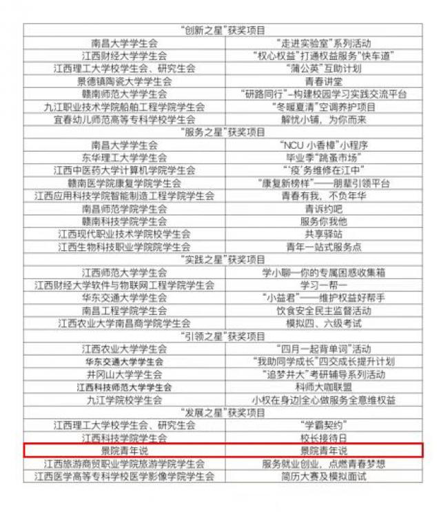 本次“我为同学做实事”——服务同学项目大赛共吸引江西各地市学联、高校学生会(研究生会)共计超过100个服务项目参评。经过推荐申报、项目审核、专家初评、终审答辩,我校学生会的“景院青年说”项目突出重围,荣获大赛“发展之星”奖项。