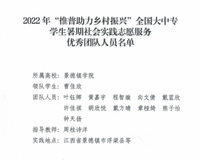 此次活动,校团委高度重视、精心组织、择优推荐,由周桂诗洋老师指导的景德镇学院“推普助力 乡村振兴”暑期社会实践志愿服务队经过与全国1068所学校的2989支实践队伍激烈竞争,作为景德镇地区唯一一支成功入选的志愿服务队开展该项社会实践活动。2022年暑假期间,实践服务队以“红色经典润赣土瓷韵推普助振兴”为主题,在江西省景德镇市浮梁县等地开展了为期4周的推普实践活动。