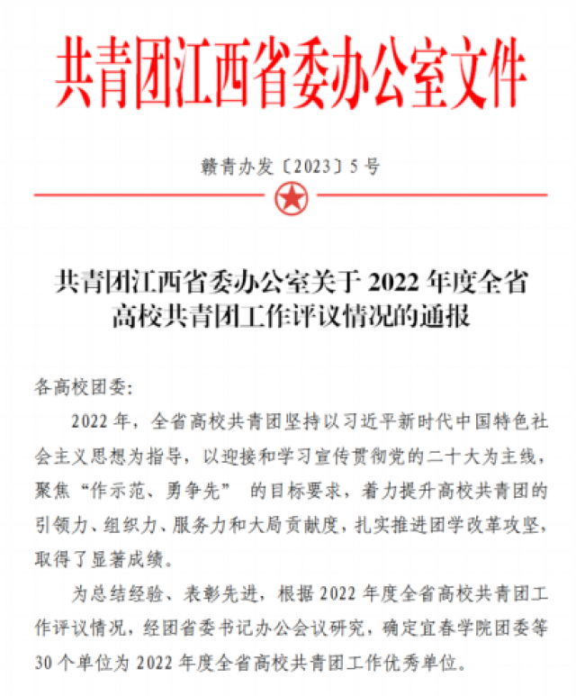 近日,共青团江西省委办公室通报了2022年度全省高校共⻘团工作优秀单位名单,我校团委在全省高校中荣获“2022年度全省高校共⻘团工作优秀单位”,是我校继2021年度之后再次获此殊荣!