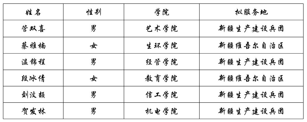 根据江西省大学生 志愿服务西部计划项目管理办公室《关于做好2021-2022年度西部计划愿者招募派遣工作的通知》要求,按照公正、公平、公开原则,经学生个人报名资格审查、学院推荐、资格审查、面试、笔试,拟推荐管双喜等6名学生为2021年西部计划志愿者人选,现予公示。