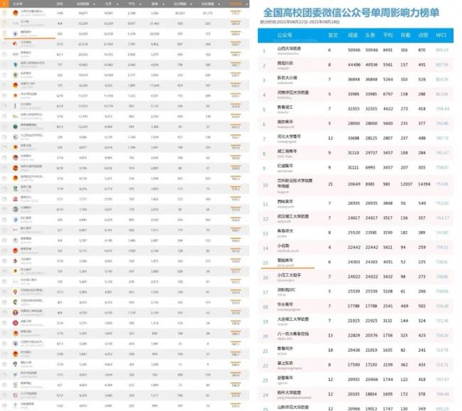 在全国普通高校团委微信公众号综合影响力排行榜中,入围全国百强榜单10余次,全国百强前五榜单1次。