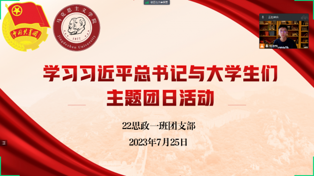 为深入学习贯彻党的二十大精神,领悟习近平总书记对当代青年的殷切嘱托,推动习近平新时代中国特色社会主义思想在广大青年学生中落地生根,马克思主义学院21级、22级各班团支部分别于线上开展“习近平总书记与大学生在一起”学习分享主题团日活动,各班团支书通过领学习近平总书记重要讲话精神及习近平总书记重要回信致信精神,引领读原著、学原文、悟原理,切实引导广大青年学生学有所思、学有所感、学有所悟。