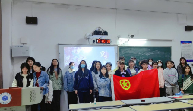 在线上,团支书鲍雯婧发布活动通知,鼓励同学们积极了解感受春日氛围并以寝室为单位推荐与春有关的文艺作品,然后再由团支书制作成PPT。在线下,全班同学一齐来到第一教学楼1409教室举行团日活动,由考勤班长张璨负责点名确认。在团支书鲍雯婧宣布本次活动主题,并带领班级成员重温入团誓词后,文体委员陈玉婷带领班级成员齐唱团歌。