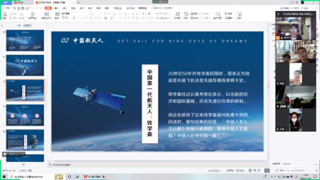 22物流管理2班于11月19日在第三教学楼3303开展“学习航天精神,谱写奋斗青春”主题活动,由团支书陈甜丽通过PPT及视频的方式,简述航天精神,了解航天领域的伟大成就。通过此次团日活动,同学们进一步认识了“特别能吃苦、特别能战斗、特别能攻关、特别能奉献”的航天精神。除此外各班也积极开展团日活动,同学们进一步学习了航天精神。