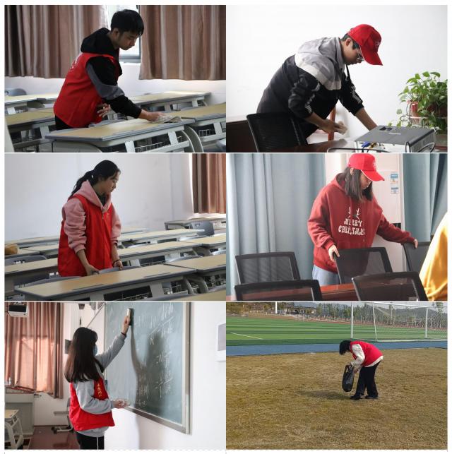 志愿者们分组对三栋教学楼、经管楼、校南门附近、学生活动中心附近和操场五个区域进行清洁。在教室里,有的同学把桌椅摆放整齐、有的同学将课桌黑板擦拭干净;操场上、校门旁……志愿者们认真清扫地面的垃圾。经过大家的努力,校园变得更加干净整洁。