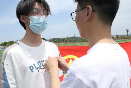 团组织代表张政带领新团员宣誓,新团员面向团旗,举起右手庄严宣誓:我志愿加入中国共产主义青年团,遵守团的章程,执行团的决议,履行团员义务,严守团的纪律,勤奋学习,积极工作,吃苦在前,享受在后,为共产主义事业而奋斗。他们的目光中闪着坚毅的光芒,充满了对共青团组织的无限向往和为团组织增添光彩的豪迈激情。