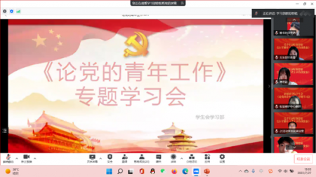 为深入学习贯彻习近平总书记关于青年工作的重要论述,团结引领广大青年以实际行动迎接党的二十大胜利召开,7月27日晚7点,景德镇学院学生会成员开展专题学习会,集中学习习近平同志《论党的青年工作》,并对近期重点工作作出要求。全体学生会成员参加会议。