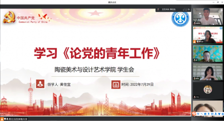 为深入学习贯彻习近平总书记在庆祝中国共产主义青年团成立100周年大会上的重要讲话精神,7月29日,陶瓷美术与设计艺术学院学生会以线上形式集中开展学习习近平总书记的《论党的青年工作》专题学习会。会议由学生会主席团成员黄佳宜主持。