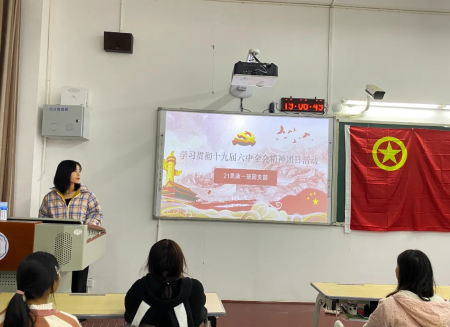21思政二班团支书熊炎怡同学则引领大家从“三个需要”、“五大历史意义”、“十个坚持”及“一个号召”四个方面领会十九届六中全会精神,与大家一同从党的百年奋斗历程相关视频体悟党的初心使命,并希望未来同学们能够以咬定青山不放松的精神状态为中华民族的伟大复兴而奋斗!