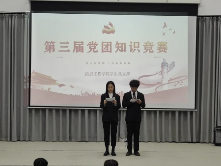 为深入学习党团知识,提高我院广大党员和团员思想政治素质,以及党性的修养。11月23日晚,信息工程学院学生党支部“知党史、强信念、跟党走”党团知识竞赛。在第三报告厅举行。信息工程学院学生党支部书记胡欣,学生代表共200余人观看了比赛。