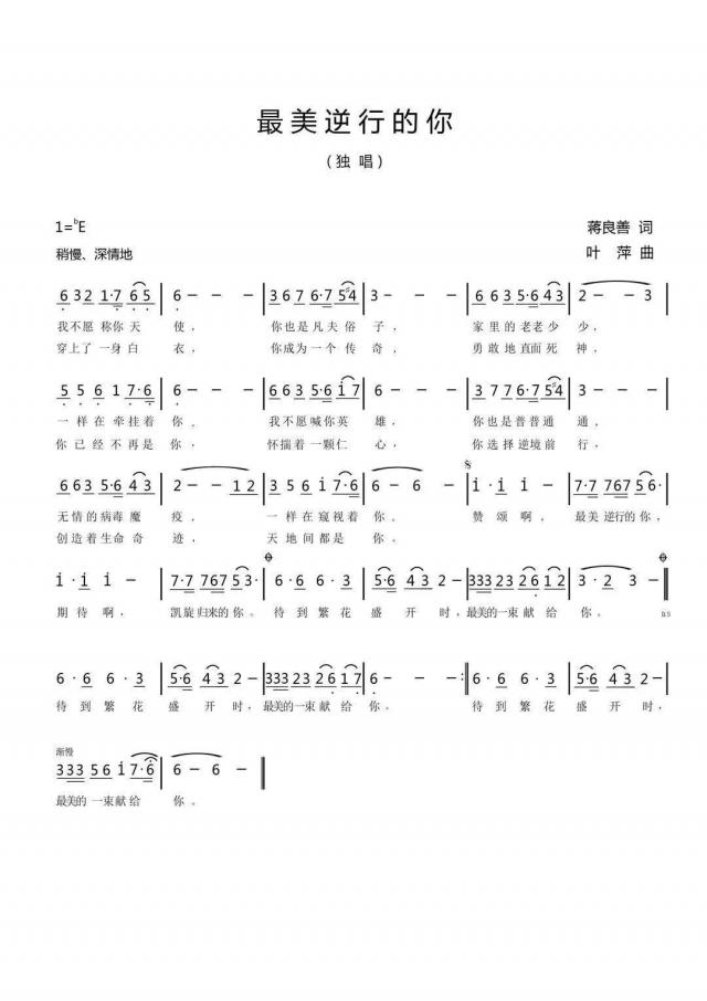 近期因疫情发展,各媒体新闻都在报道疫情现状和抗“疫”相关的新闻,当叶萍老师看到一批批医务人员整装待发向武汉前进的画面时,内心颇为感动。看着屏幕里他们夜以继日的身影,看到他们离开家的不舍与坚决,看到他们为拯救生命留下的伤口和汗水,他都在想同样是平凡的生命、都有自己的家,这些白衣天使却撑起了多么无上的伟大啊。这种为大爱舍小我的无私精神始终让他的内心久久不能平静。直到大年初六中午,当叶萍看到了蒋良善写下的的歌词,“你也是凡夫俗子”“你也是普普通通”,看到这些朴素却意味深长的歌词,他深有同感,灵感顿时喷涌而出,竟午饭也忘了吃就开始作曲。由于叶萍老师平时在学校向学生教授作曲课程、讲授作曲方式的同时,也注重积累多种创作方法,平时的教学积累加快了完成作曲的进度。为了当晚完成,叶老师熬夜到深夜两点才落笔。