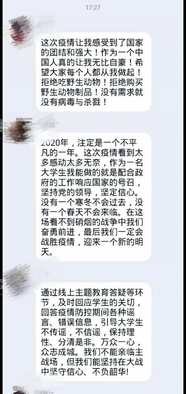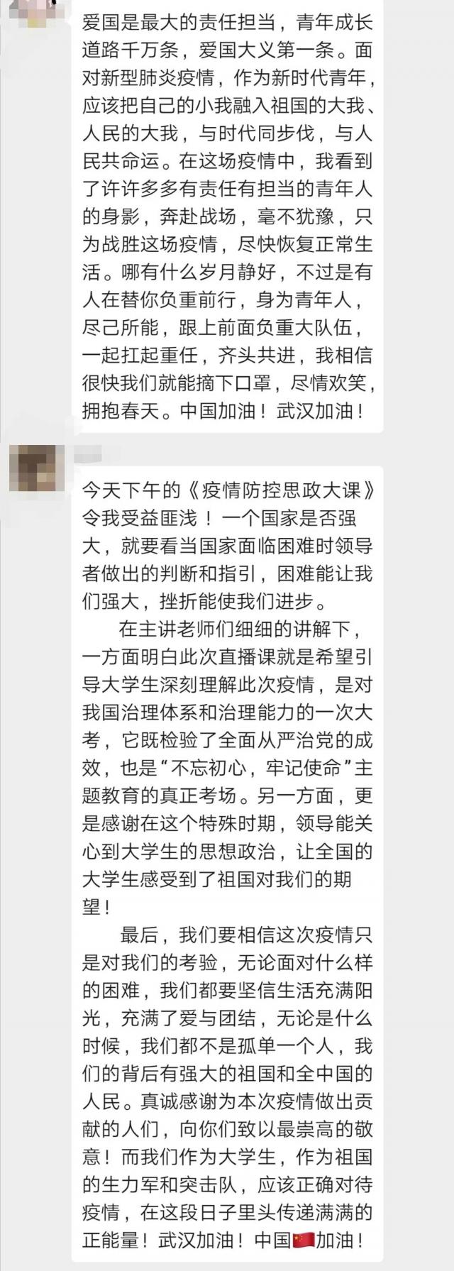 当日,马院学子们在老师的组织下在家认真观看课堂直播,并在各班班长组织下进行了线上讨论。同学们更是在观看完课程直播后,内心激荡起一股浓浓的爱国情,有感而发,写下了内心最真实深切的感受。