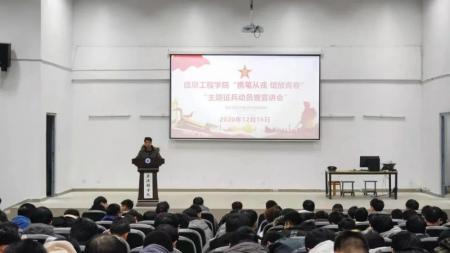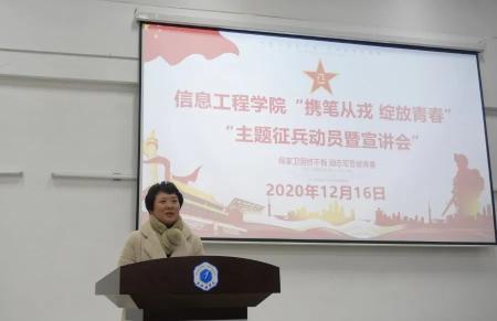 为推进国防和军队现代化建设,扎实做好征兵宣传工作,鼓励大学生积极应征入伍。12月16日晚上,信工学院2021届大学生“携笔从戎、绽放青春”主题征兵动员暨宣讲会在外语楼报告厅举行。学院党总支副书记练缤艳、学生工作科长兼团委副书记吕云飞、全体辅导员、退伍士兵宣讲团、2021届毕业生及部分非毕业生200余人参加会议。会议由学生工作科长兼团委副书记吕云飞主持。