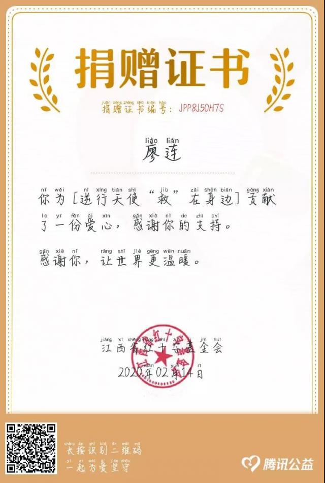 在积极参与志愿服务的同时,廖连同学也积极参与公益活动,并号召亲朋好友积极捐款捐物,她通过江西红十字会腾讯公益平台的白衣天使“救”在身边公益活动,为奋战在一线的白衣天使们捐款,奉献爱心,送去祝福和温暖。