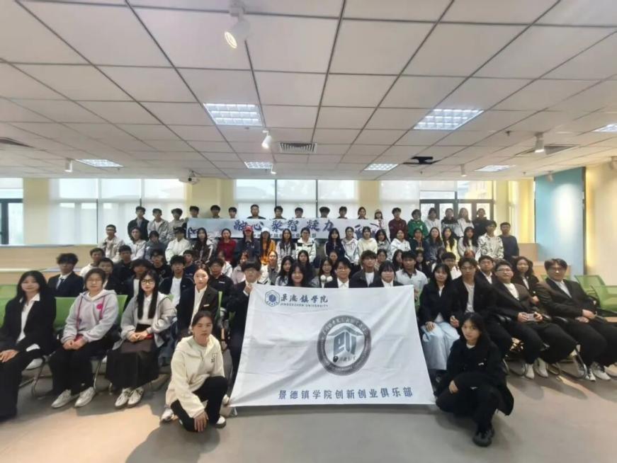 换届大会结束后,全体成员手持 “景德镇学院创新创业俱乐部” 旗帜合影留念,定格下这一意义非凡的时刻。随后,部员们在各部长的带领下参观了创新创业学院,详细了解入驻项目的运营模式与发展成果,对学院的平台优势与双创生态有了更全面的认识。