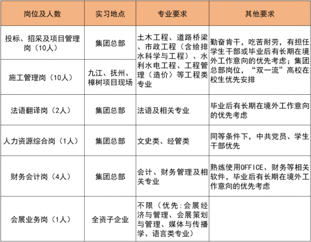 1.投标、招采及项目管理岗、法语翻译岗、人力资源综合岗、财务会计岗,只接受2025年应届在校生投递;施工管理岗、会展业务岗可接受其他低年级的在校生投递。