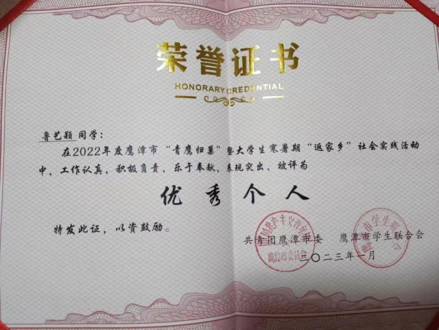 鲁艺颖,马克思主义学院2021级本科生,校青年志愿者协会成员。在2022-2023年,该生共参与疫情防控、生态保护、就业招聘、童心港湾、运动赛事志愿服务、政策宣传等多个方面的社会实践活动,累计实践时长300余小时。