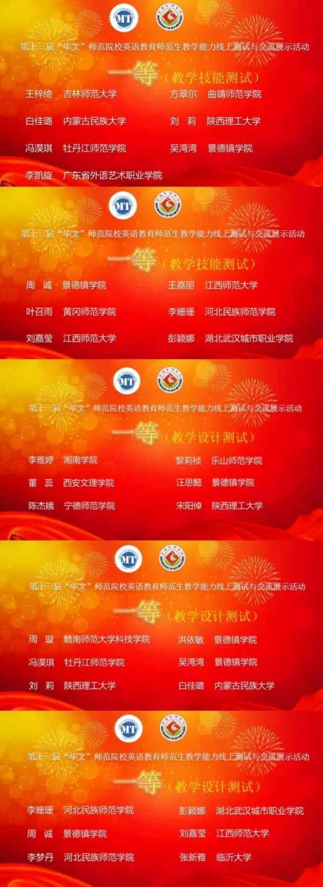 近日,第十一届“华文”师范院校英语教育师范生教学能力线上测试与交流展示活动落下帷幕。我校学子喜获佳绩,荣获一等奖6项、二等奖8项、三等奖2项。
