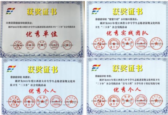 近日,江西省委宣传部、省文明办、省教育厅、团省委、省学联公布了2021年江西省大中专学生志愿者暑期“三下乡”社会实践活动获奖情况,景德镇学院荣获多项荣誉。校团委荣获江西省“返家乡”社会实践优秀单位(江西省唯一入选高校)和全省“三下乡”社会实践活动优秀单位;“蜜蜜行动”乡村振兴服务队荣获全省优秀实践团队;郑勇军、董琛、高海萍、黄靖荣获全省优秀个人;人文学院李燕荣获“青马工程”大学生骨干基层实践专项优秀个人;马克思主义学院王希琳荣获“扬帆计划”大学生实习专项优秀个人;体育学院贺学成荣获“返家乡”社会实践优秀个人。