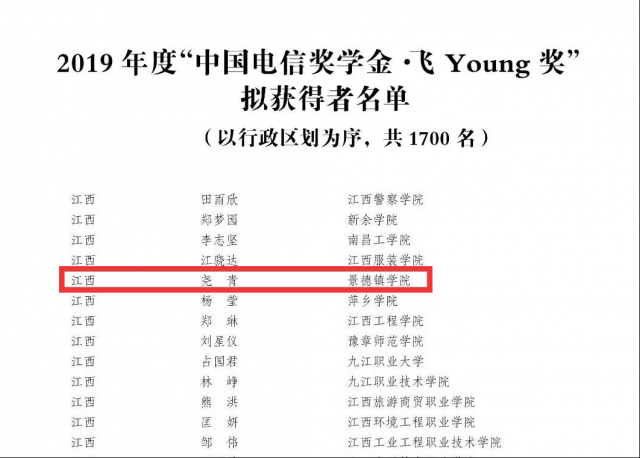 据悉,“中国电信奖学金”遴选活动由共青团中央、中国电信集团公司、全国学联共同主办,旨在深入发掘青年学生践行社会主义核心价值观的优秀典型,凝聚和引领当代大学生树立远大理想、热爱伟大祖国、担当时代责任、勇于砥砺奋斗、练就过硬本领、锤炼品德修为。今年,全国共评选产生1700名“中国电信奖学金·飞Young奖”获得者。