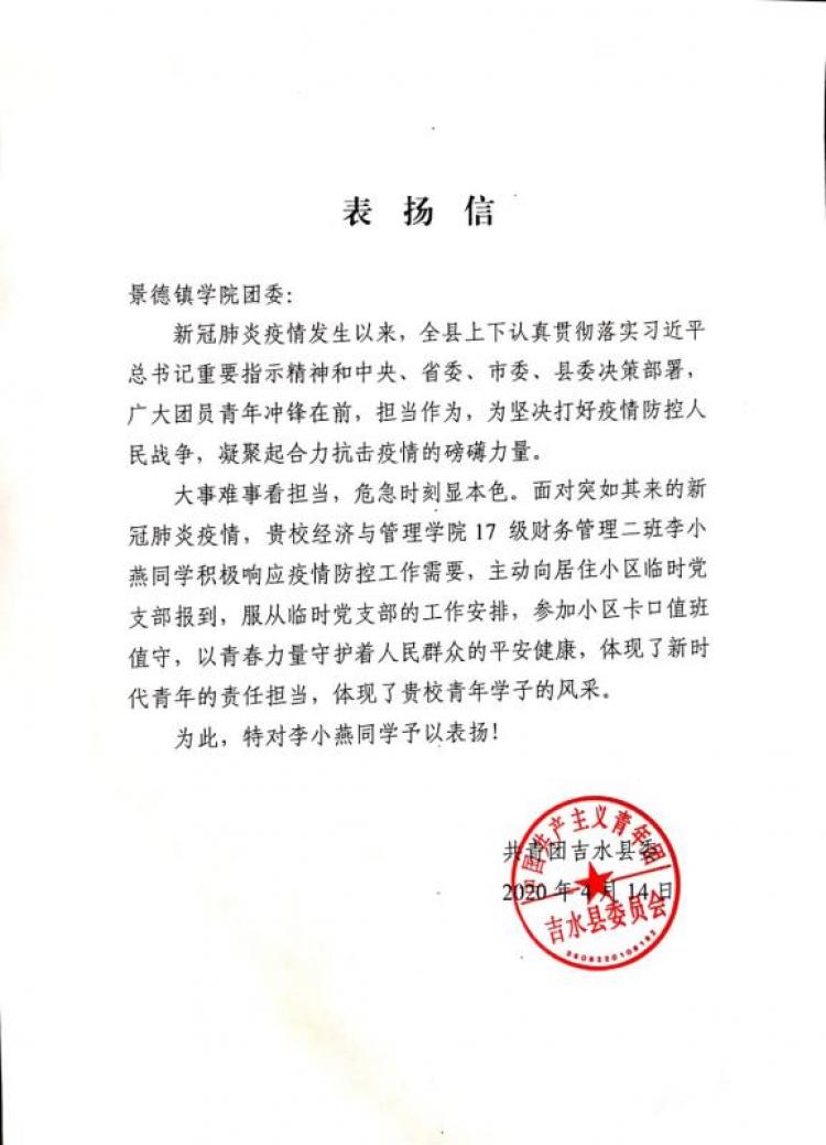 (本网讯:徐欣鹏)近日,校团委收到来自共青团吉水县委的表扬信,对积极参与新冠肺炎疫情防控工作的我校学子李小燕予以表扬。