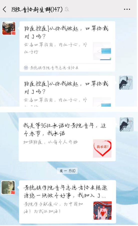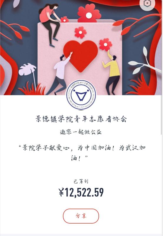 (本网讯|张琳徐欣鹏)连日来,景德镇学院团委按照景德镇学院疫情防控工作领导小组相关部署,广泛组织动员团员青年有序参与防控工作,发起了“景院学子献爱心,为武汉加油,为中国加油”的公益募捐活动,得到了景院学子的热烈响应。