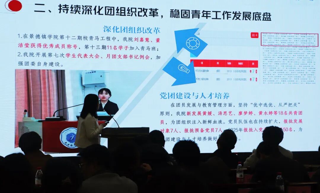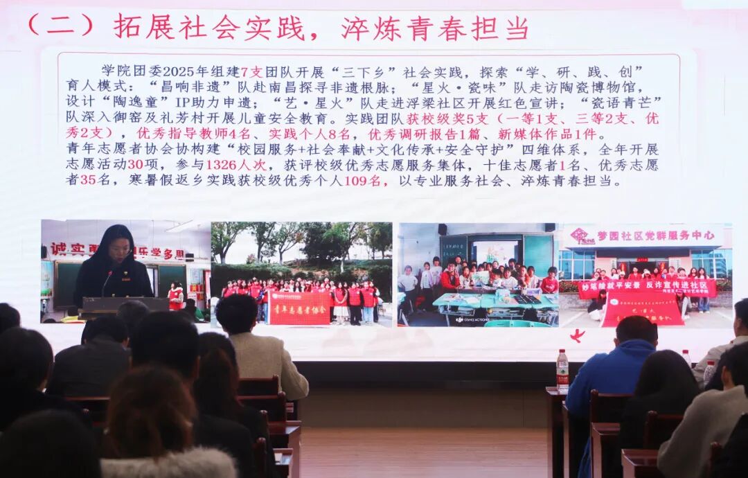 校党委副书记王丽心对全校各级团组织2025年的工作予以充分肯定。他指出,过去一年校团委在校党委的坚强领导和团省委的有力指导下,思想引领走深走实、组织建设纵深推进、实践育人彰显担当、校园文化特色凸显、创新创业提质增效,各项工作亮点纷呈,交出了一份沉甸甸的青春答卷。王丽心书记对全体团干部提出三点要求:一是筑牢青年信仰之基。 要把思想政治引领作为首要任务,深化学习贯彻习近平新时代中国特色社会主义思想主题教育,用好景德镇红色和陶瓷文化资源,推动理论教育与青年成长深度融合,让听党话、跟党走成为景院青年的鲜明标识。二是做实青年服务之事。 要把青年满意度作为衡量工作的根本标准,精准把握青年在学业、就业、心理等方面的多元需求,做优第二课堂、青年夜校等服务载体,让共青团成为青年师生靠得住的“青年之家”。三是彰显青年担当之为。 要把共青团工作放到学校发展大局中谋划,紧扣陶瓷文化试验区建设等重大任务,持续深化实践育人,引导青年在实践中长才干、作贡献。