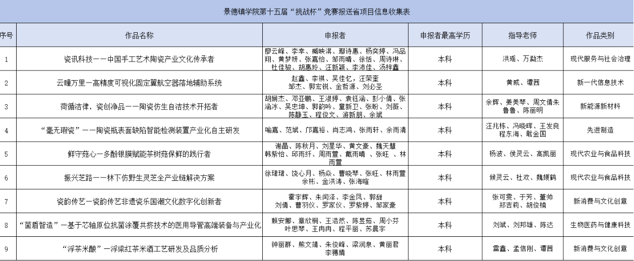根据第十五届“挑战杯”全国大学生创业计划竞赛江西赛区比赛的通知要求,学校组织开展了竞赛申报遴选工作,经过项目申报、资料审核、综合评议等环节,拟推荐以下9件项目作品参加省赛,现予以公示:
