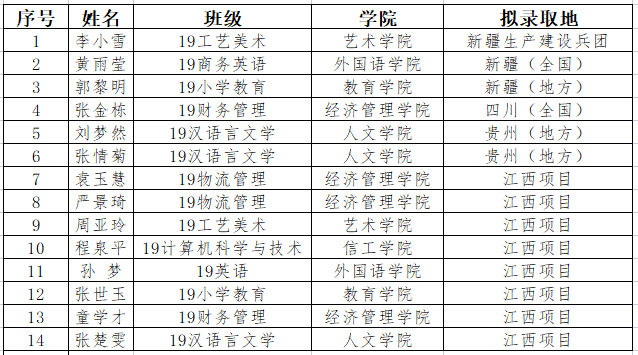 根据江西省大学生志愿服务西部计划项目管理办公室《关于做好2023-2024年度西部计划志愿者招募派遣工作的通知》要求,我校在公开招募、自愿报名的基础上,严格招募选拔流程,经学工处、教务处、校团委资格审查、笔试、面试、心理测试环节,拟录取李小雪等14名我校应届毕业生为2023年大学生志愿服务西部计划志愿者,具体拟录取名单如下: