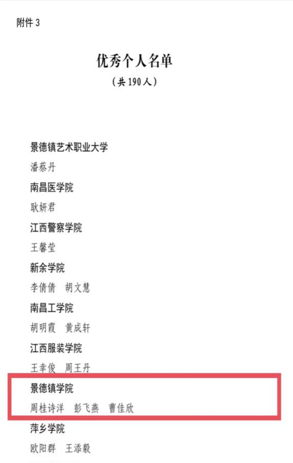 近日,中共江西省委宣传部、江西省文明办、江西省教育厅、共青团江西省委、江西省学生联合会下发了《关于2022年江西省大中专学生志愿者暑期“三下乡”社会实践活动的通报》。我校“三下乡”团队“景德镇学院赴江西省景德镇市及周边乡镇推普助力乡村振兴服务队”荣获2022年江西省大中专学生志愿者暑期“三下乡”社会实践活动“优秀实践团队”称号,我校教师周桂诗洋、经管学院彭飞燕同学、教育学院曹佳欣同学荣获“优秀个人”荣誉称号。