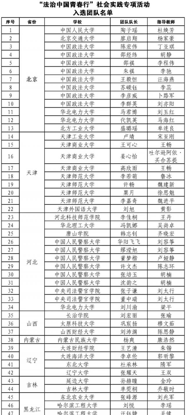 为深入贯彻党的二十大精神,贯彻落实习近平法治思想和习近平总书记关于青年工作的重要思想,动员广大高校学生投身基层法治实践,弘扬社会主义法治精神,拟于2023年暑期开展“法治中国青春行”全国大学生暑期社会实践专项活动。近日公布了全国各高校348支入选团队名单,我校吴姝韵老师指导的社会实践团队成功入选。