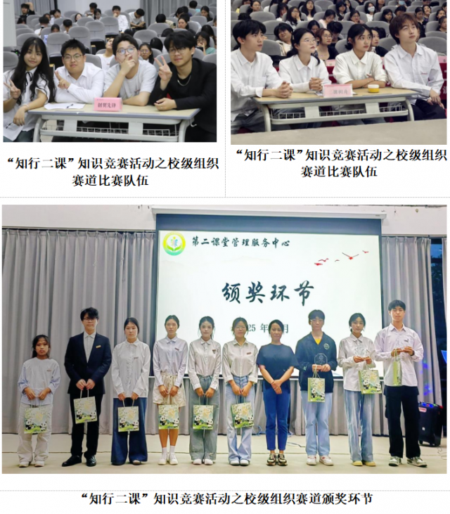为深入贯彻《景德镇学院“第二课堂成绩单”制度实施办法》,全面推进校园学分文化建设,构建各二级学院、校级组织与第二课堂管理服务中心的协同机制,第二课堂管理服务中心成功举办了“星火二课”系列活动之“知行二课”知识竞赛活动。本次活动采用双赛道竞赛模式,分别面向二级学院和校级组织两个参赛群体。第二课堂管理服务中心于2025年4月27日至4月29日晚在第三报告厅开展了二级学院赛道活动,于2025年5月7日至5月9日晚在第三报告厅开展了校级组织赛道活动。